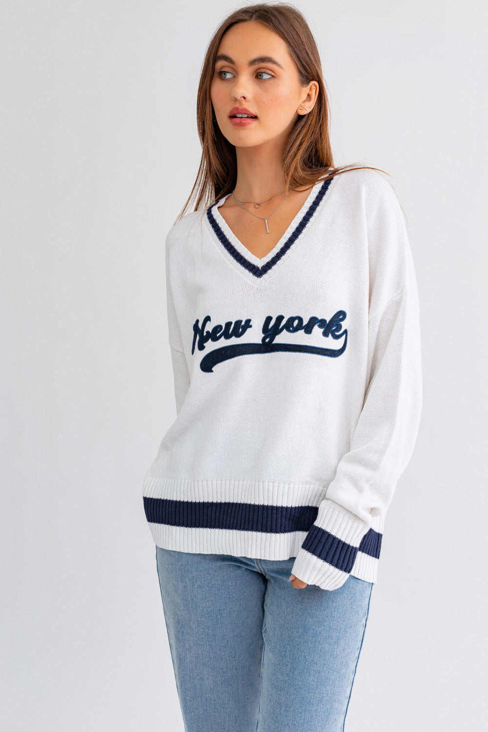 This beautiful White, V neck, knitted, "New York" sweater is the perfect everyday sweater for your everyday outfits.